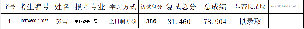 按照学校2026年研究生招生复试工作安排,我院又新增全日制专硕招生计划1个,现从递补拟录取考生中依次拟录取,现将拟录取考生的复试成绩及结果予以公示,复试成绩及拟录取结果如下。