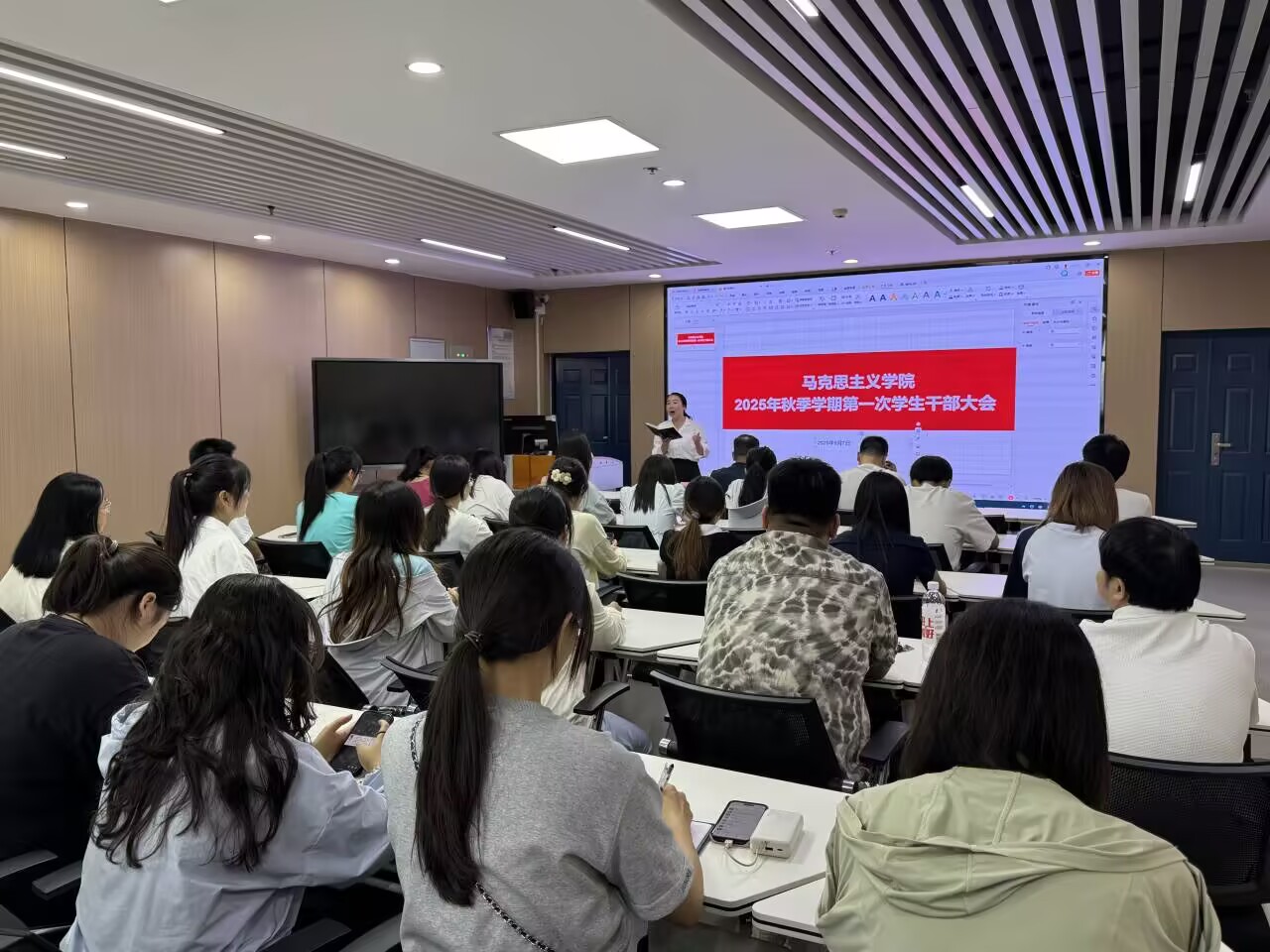 (通讯员 鲁俊良/文 成春燕 鲁俊良/摄)新学期,新气象。9月7日下午,马克思主义学院在文科楼1008室举行新学期第一次全体学生干部大会,学院党委副书记竺正海,学工办主任张云雾,辅导员邓鹏,本、研各班级的班长、团支书,以及团委学生会、研究生会主席团成员参会。