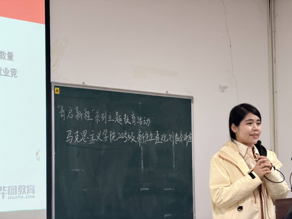 (通讯员 丁靖易/文 彭振午 阳玉莹/摄)为帮助新生明晰职业发展方向,破解学业和就业困惑,9月18日下午,华图教育陆婷老师受邀为马克思主义学院2025级新生作职业规划教育讲座,班主任张云雾老师及大一全体新生共同参与,现场学习氛围浓厚。